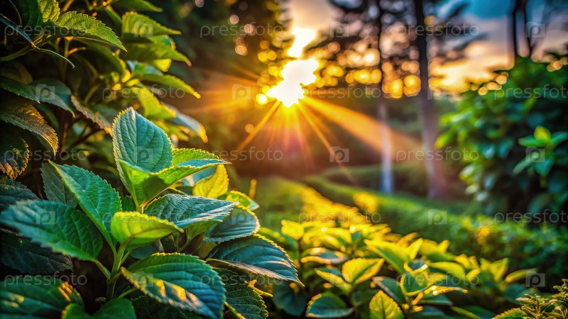 Роскошные темно-зеленые листья греются на солнце в спокойном саду при закате