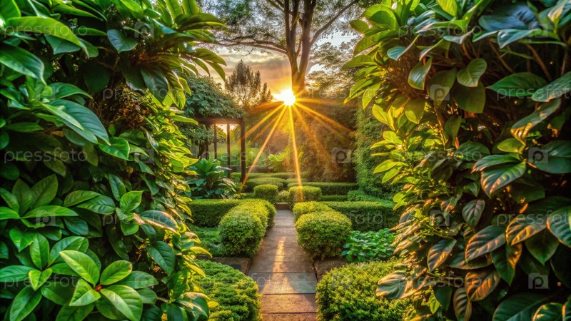 Роскошные темно-зеленые листья оформляют яркий закат в спокойной садовой обстановке