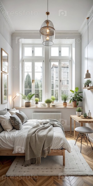 Уютная скандинавская спальня с большими окнами и пышными комнатными растениями