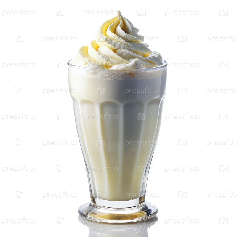 Вкусный ванильный молочный коктейль, покрытый битой сливкой на ярком фоне