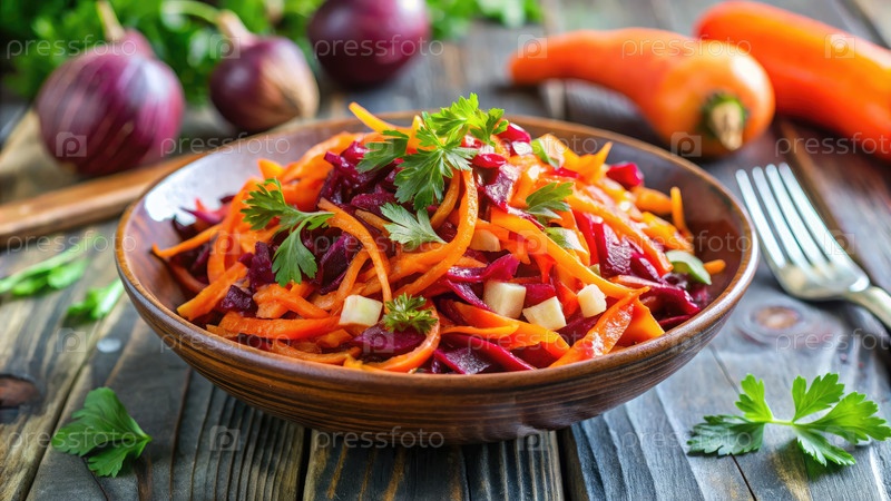 Свежий салат из свежей свеклы и моркови, украшенный травами на деревянном столке