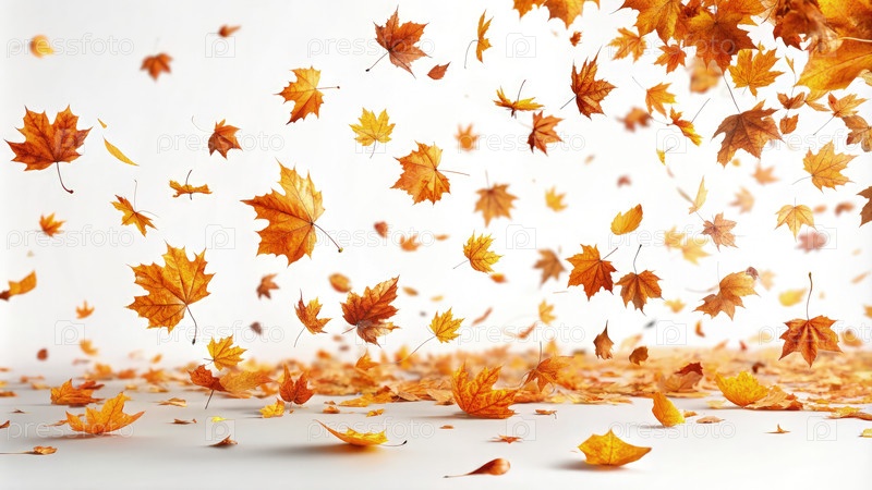 Осенние оранжевые листья грациозно вращаются на белом фоне