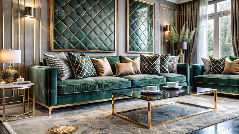 Роскошный бархатный диван в гостиной арт-деко с элегантными декоративными деталями