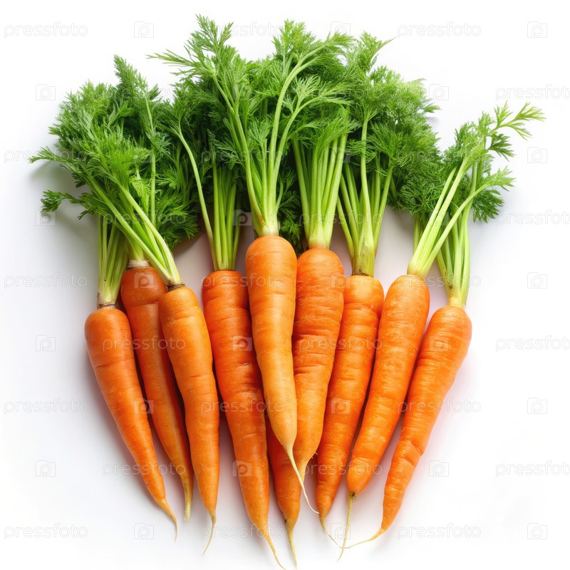 Свежие морковь с лиственничными вершинами, расположенными на белом фоне в стандартной шкале