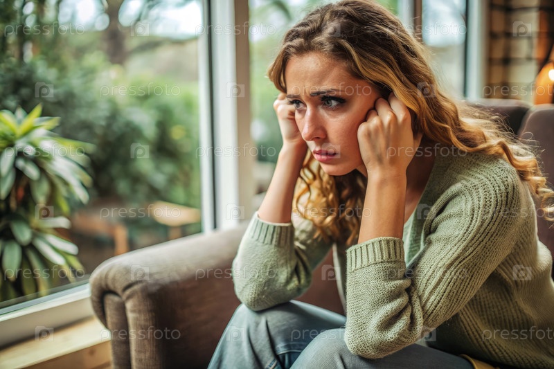 Печальная женщина сидит на диване в спокойной гостиной, выражая беспокойство и тревогу