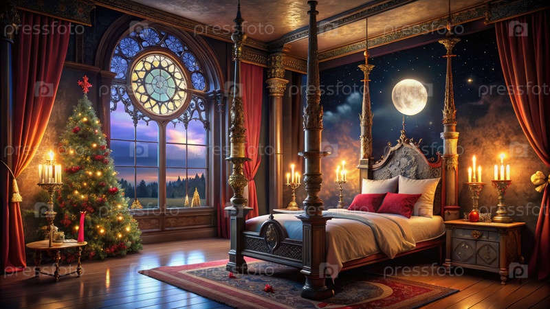 Романтическая готическая спальня из замка с лунным видом и праздничными украшениями