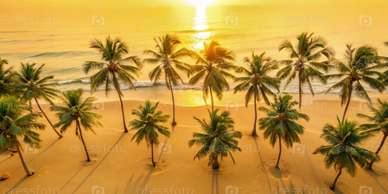 Вид с воздуха солнечного пляжа с пальмами во время заката в тропическом раю