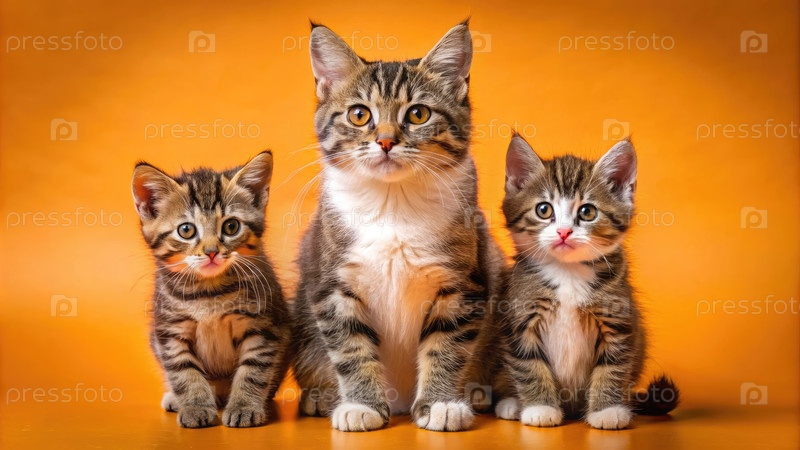 Два котенка и одна взрослая кошка на ярко-оранжевом фоне