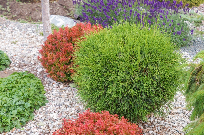 Зеленый шаровидный можжевельник в саду с красным барбарисом и фиолетовой лавандой — декоративные кустарники на белой гальке, ландшафтное озеленение