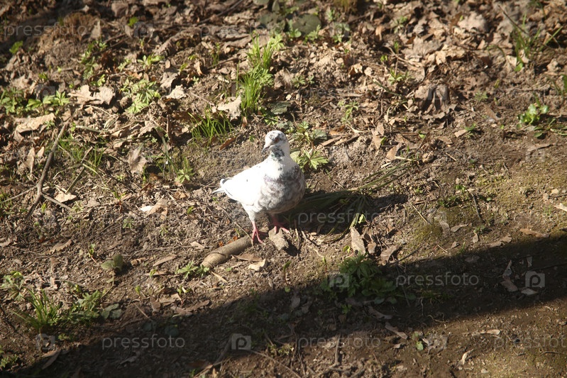 Птица серо-белый голубь стоит на земле