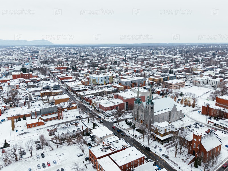 Зимний вид города Гранби с заснеженными улицами, церковными зданиями и городским ландшафтом, Квебек, Канада. g