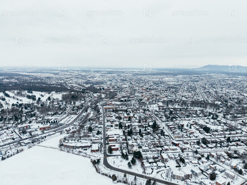 Зимний вид города Гранби с заснеженными улицами, церковными зданиями и городским ландшафтом, Квебек, Канада. g