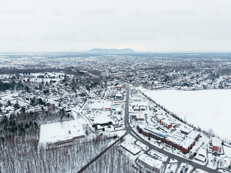 Зимний вид города Гранби с заснеженными улицами, церковными зданиями и городским ландшафтом, Квебек, Канада. g