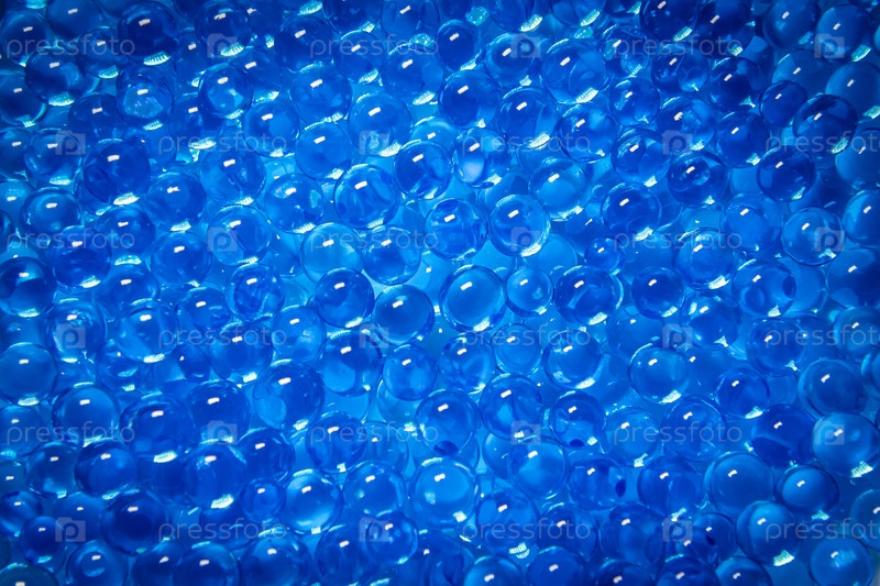 Макросъемка, план сверху: прозрачные синие шарики гидрогеля, заполняют весь кадр, блики и отражения света создают глянцевый мокрый эффект