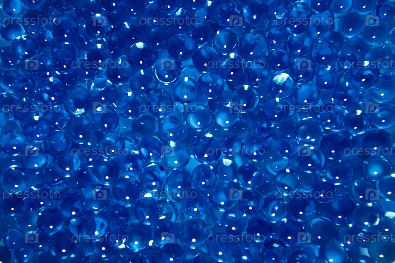Макросъемка, план сверху: прозрачные синие шарики гидрогеля, заполняют весь кадр, блики и отражения света создают глянцевый мокрый эффект