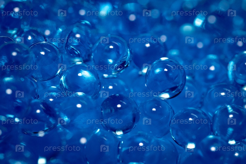 Макросъемка прозрачных синих шариков гидрогеля, заполняющих весь кадр