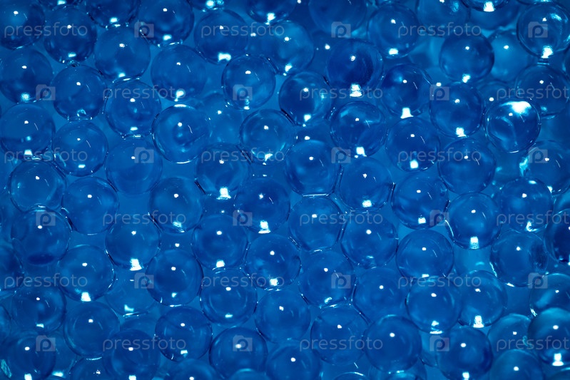 Макросъемка, план сверху: прозрачные синие шарики гидрогеля, заполняют весь кадр, блики и отражения света создают глянцевый мокрый эффект