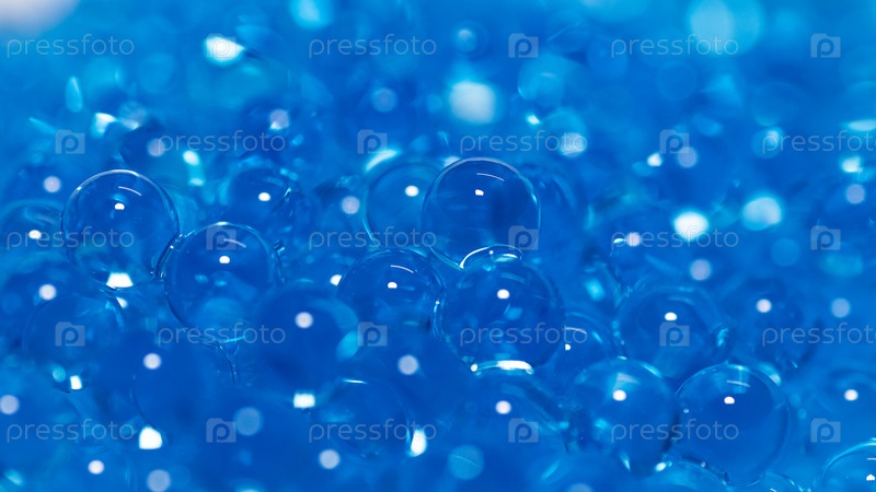 Макросъемка прозрачных синих шариков гидрогеля, заполняющих весь кадр