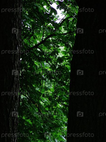 Листья среди стволов деревьев. Михайловский Сад. Санкт-Петребург