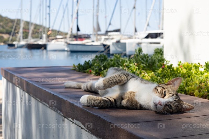 Кошка полосатая спящая в тени деревьев в порту города Каш Турция