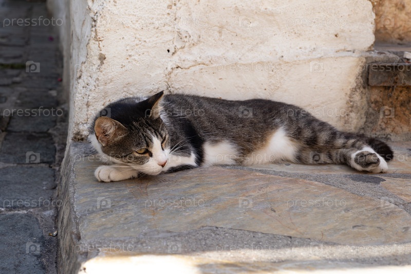 Кошка полосатая спящая в тени деревьев в порту города Каш Турция