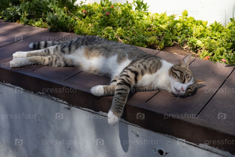 Кошка полосатая спящая в тени деревьев в порту города Каш Турция
