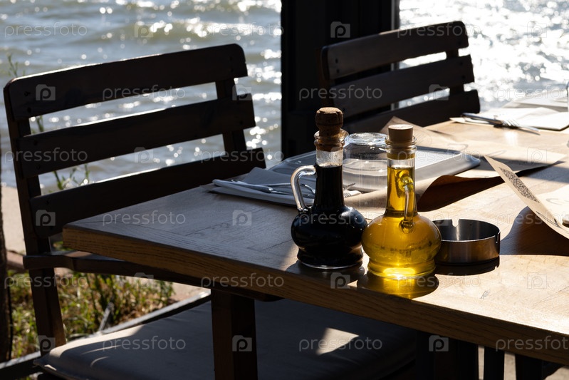 Стол в ресторане на берегу моря, оливковое масло в бутылке крупный план