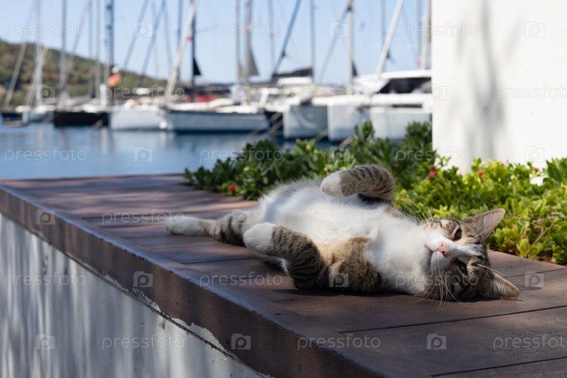 Кошка полосатая спящая в тени деревьев в порту города Каш Турция