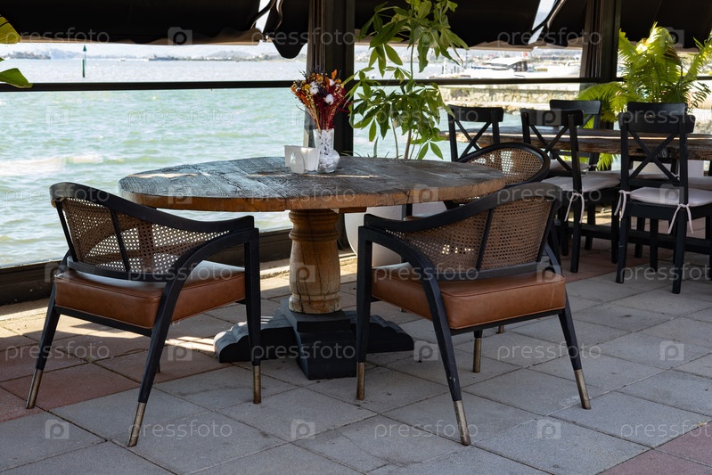 Кафе ресторан с видом на море и горы, ваза с цветами на круглом деревянном столе