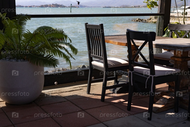 Кафе ресторан с видом на море и горы, мебель из темного дерева