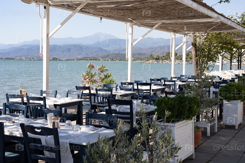 Кафе ресторан с видом на море и горы, столы покрытые белой скатертью