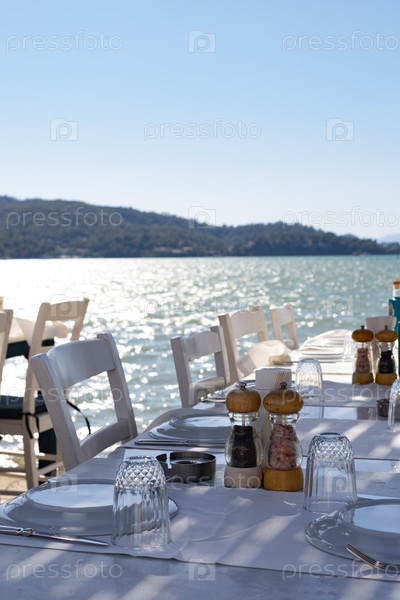 Кафе ресторан с видом на море и горы, столы покрытые белой скатертью, крупный план