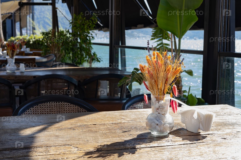 Кафе ресторан с видом на море и горы, ваза с цветами на столе