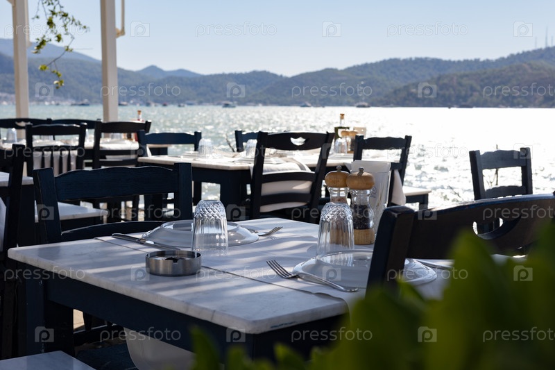 Кафе ресторан с видом на море и горы, мебель из темного дерева