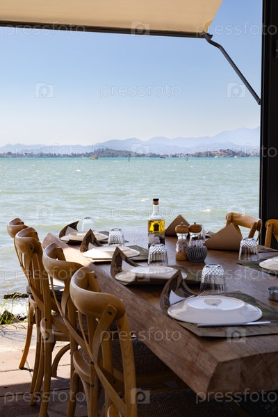 Кафе ресторан с видом на море и горы, столы сервированные из дерева