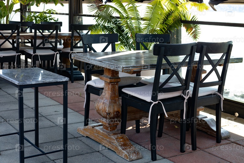 Кафе ресторан с видом на море и горы, мебель из темного дерева