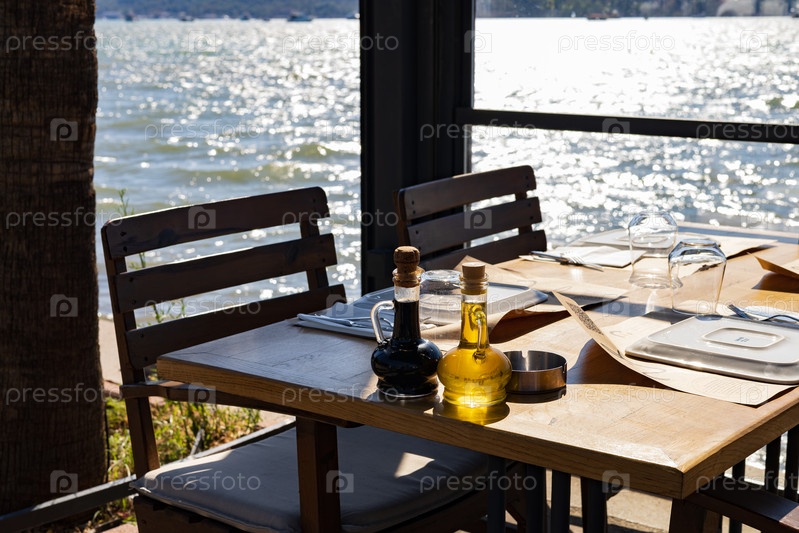 Кафе ресторан с видом на море и горы, стол крупный план