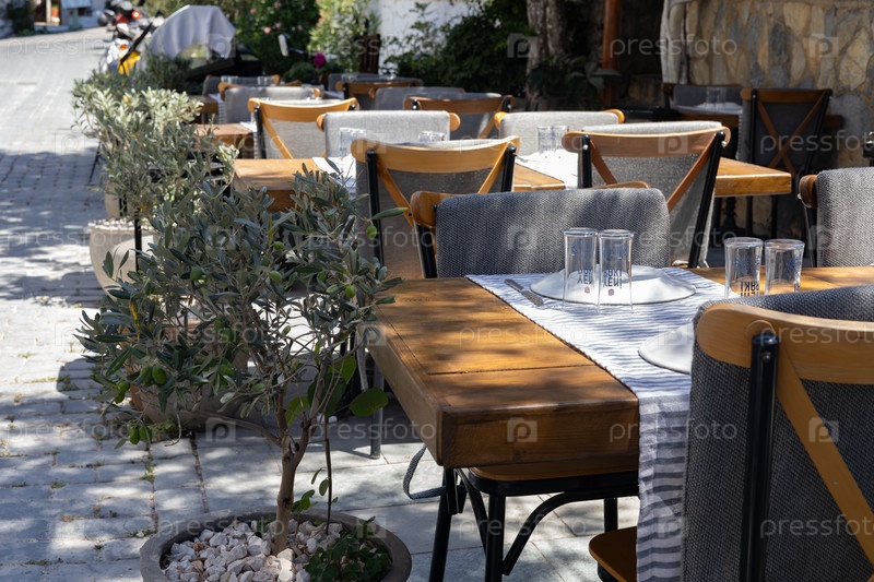 Кафе ресторан на открытом воздухе, мебель из дерева, брусчатка
