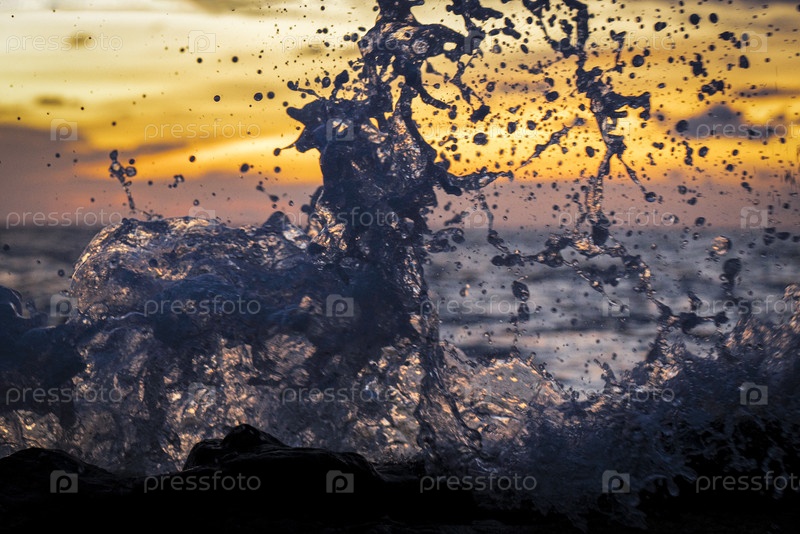 Брызги разбившихся волн в лучах заката