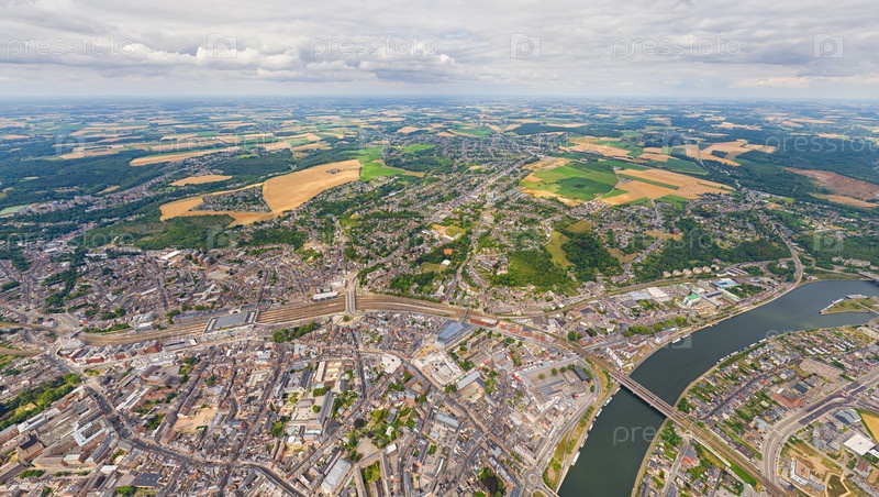 Намур, Бельгия.Панорама города.Летний день, облачная погода.Вид с воздуха