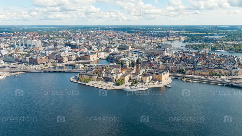 Стокгольм, Швеция. Остров Риддархольмен и озеро Маларен. Церковь Риддархольмена. Панорама города. Летний день, Aerial View