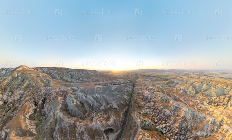 Гореме, Невшехир, Турция. Широкий панорамный взгляд с воздуха на Долину Деврента летом. Обширный пейзаж со сказочными дымоходами и разрушенными вулканическими образованиями при закате солнца. Вид с воздуха