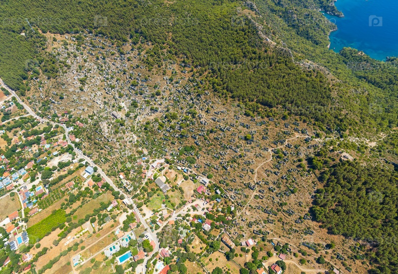 Панорамная аэрофотосъемка обширных руин городов-призраков, простирающихся по горным склонам с средиземноморским пейзажем на заднем плане