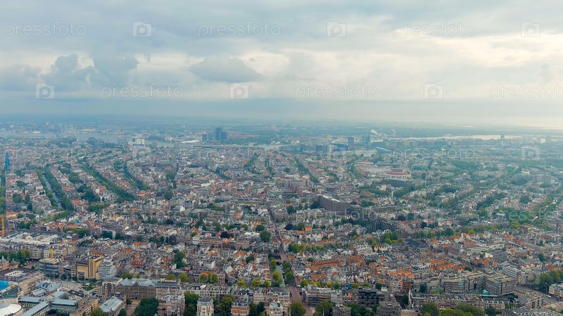 Амстердам, Нидерланды Исторический центр города с каналами Панорамный вид на город летом в пасмурную погоду