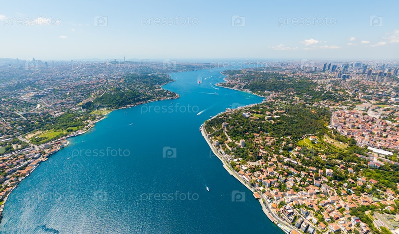Стамбул, Турция.Птичий взгляд на европейские и азиатские берега вдоль Босфорского пролива при летнем солнечном свете.Авиапоказ