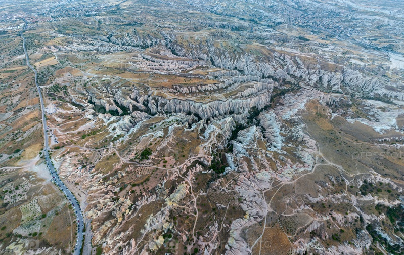 Обширный взгляд с воздуха на сломанное плато Каппадокии, показывающий запутанную сеть разветвленных долин, создающих фрактальные узоры по вулканической местности