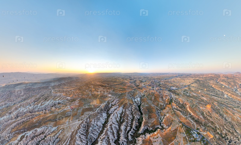 Гореме, Невшехир, Турция. обширный панорамный вид Каппадокии с флотом воздушных шаров над солнечным плато и глубокими долинами на рассвете