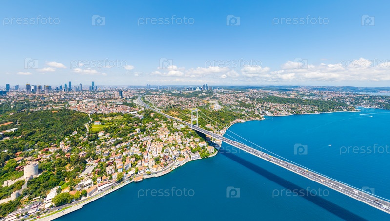 Стамбул, Турция.Мост Фатиха султана Мехмета - это подвесный мост через Босфорский пролив между Европой и Азией.Летний солнечный день.Вид с воздуха