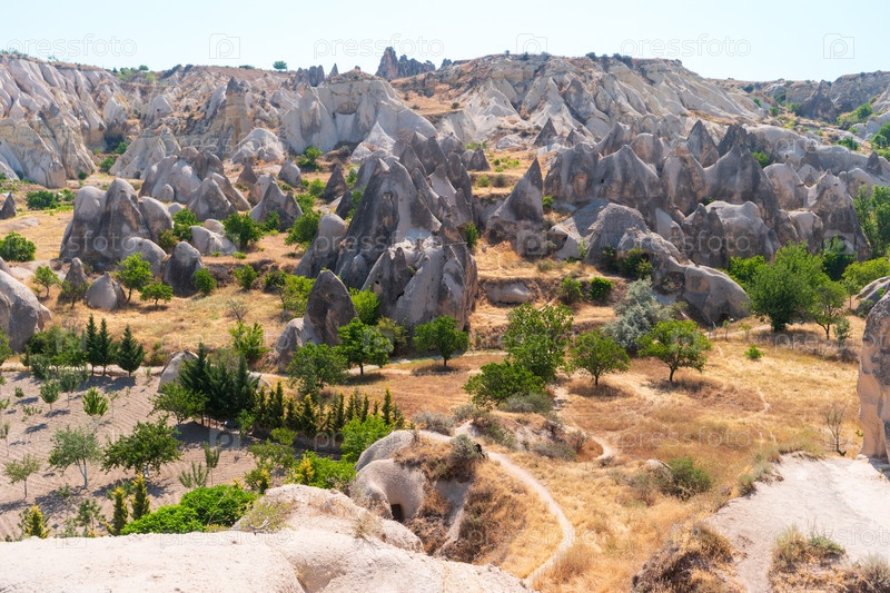 Гореме, Невшехир, Турция. светлые эрозионные горные образования с пересекающейся зеленью, деревьями и кустарниками в середине земли, огромное пространство подобных образований под прозрачным голубым утренним небом
