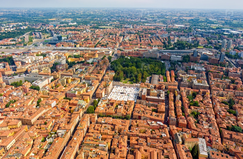Болонья, Италия. Центральный железнодорожный вокзал и рынок на площади Отта-Августа. Панорама города в летний день. Солнечная погода. Вид с воздуха